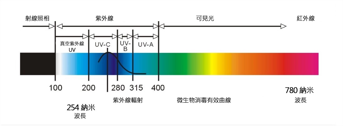 波長254nm的光束,與病毒、黴菌等單細胞生物的生命中樞DNA(去氧核醣核酸)會產生光化反應,使細菌死亡或喪失再生繁殖的能力。